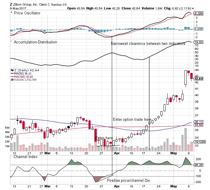 The long call option trade entry is where the vertical line starting from an upswing in  Accumulation/Distribution